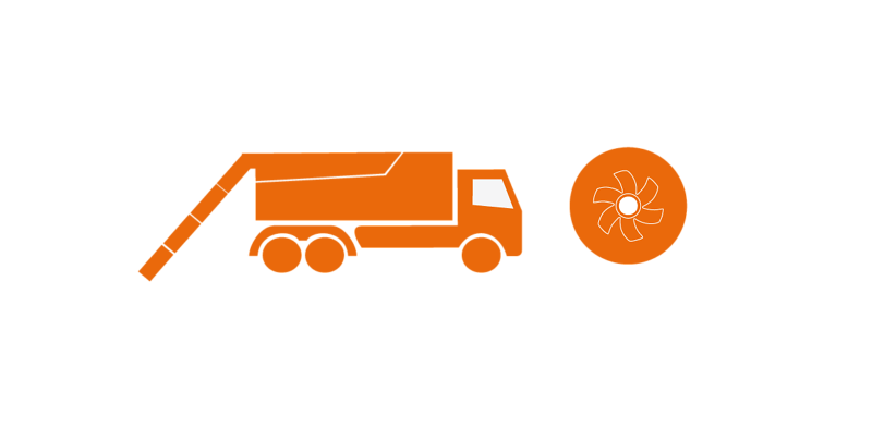 Im direkten Vergleich liegen der Vakuumsaugwagen und der Saugbagger sehr weit auseinander. Dies ist auf die zwei verschiedenen Funktionsprinzipien zurückzuführen. Der Ventilator des Saugbaggers erzeugt einen Volumenluftstrom von 42.000 m³. Dieser hohe Volumenluftstrom wird benötigt, um das Material mitzureißen. Im Gegensatz dazu ist für den Vakuumsaugwagen der benötigte Unterdruck die entscheidende Größe, um das Material zu befördern.