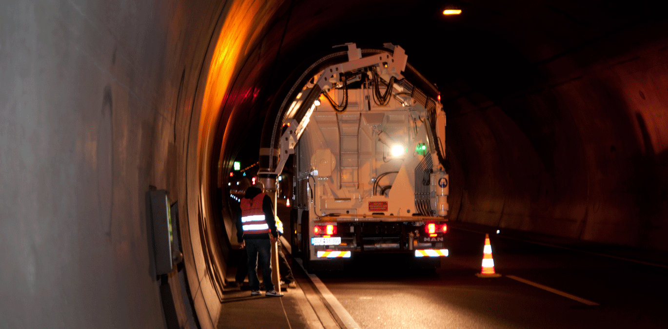 Suction technology has now established itself not only in the construction sector, but also for cleaning or retrofitting work. What used to be a laborious and expensive manual task can now be carried out by the suction excavator with outstanding speed. The cleaning of the tunnel slot channels can be done in one night without causing major traffic disruptions.